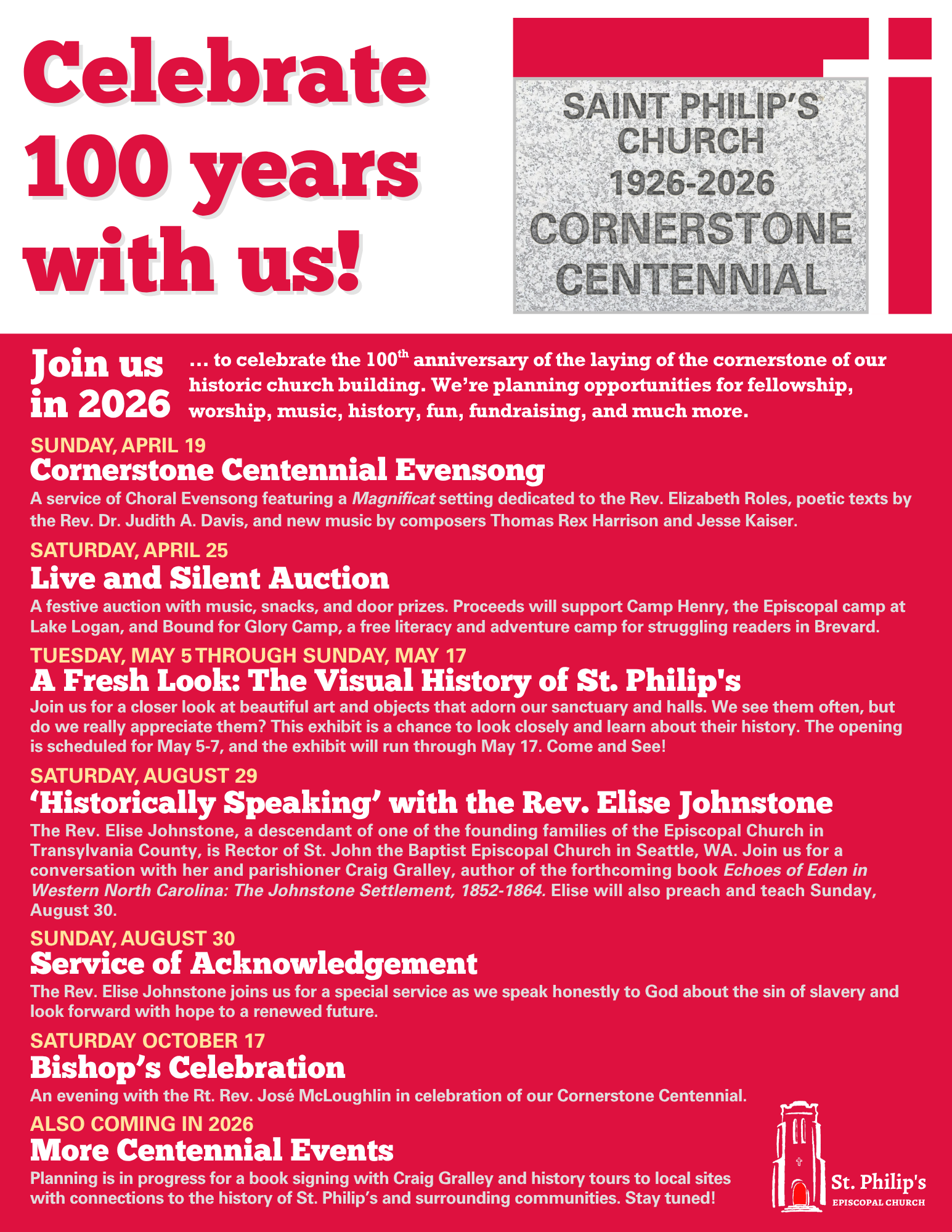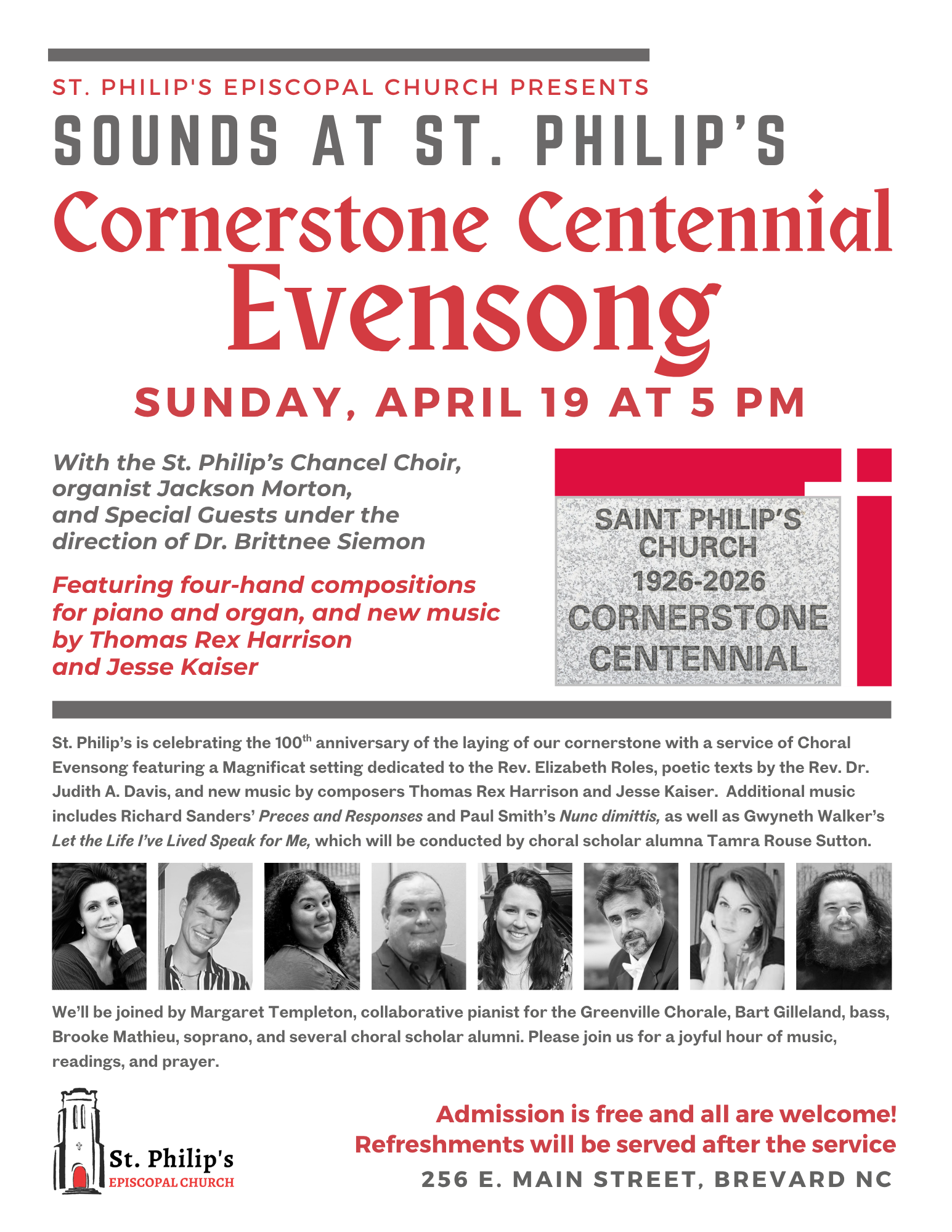 This service of Choral Evensong will be sung by the St. Philip’s Chancel Choir, with organist Jackson Morton and special guests under the direction of Dr. Brittnee Siemon.