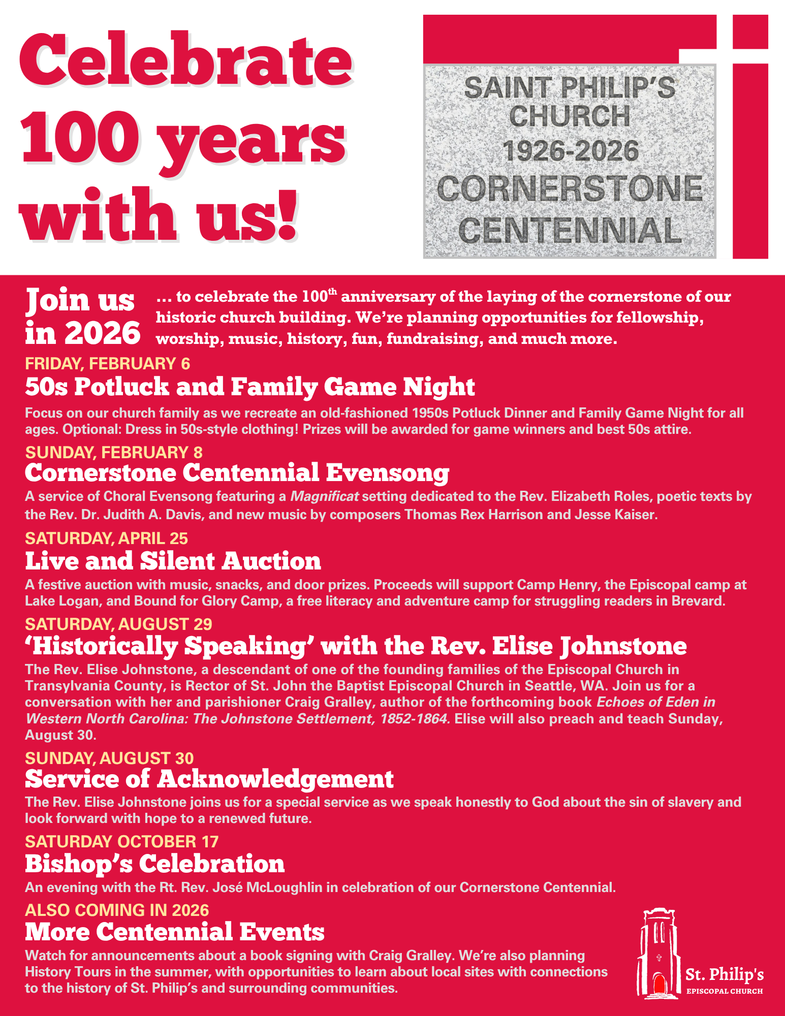 Please join St. Philip's in 2026 as we celebrate the 100th anniversary of the laying of the cornerstone for our historic church building! Watch this space for details of the events listed in the flyer above.